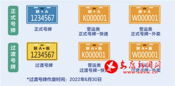電動(dòng)自行車號牌號碼均為7位數(shù)字。正式的電動(dòng)自行車號牌底色為藍(lán)色,字體和框線為白色;過渡號牌底色為黃色,字體和框線為黑色。營運(yùn)類號牌底色為橘色,字體和線框?yàn)榘咨?/span>