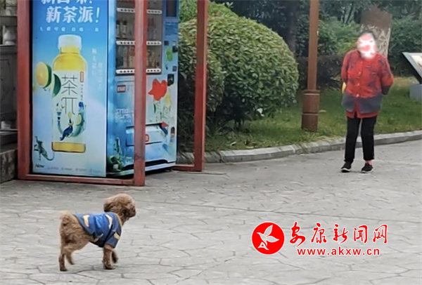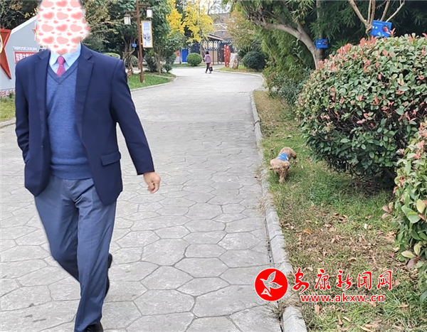 11月8日下午,興安公園小廣場內有市民遛狗未牽繩,寵物犬綠地隨意便溺。(圖文/周薇)