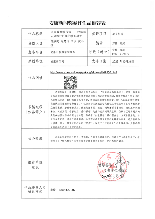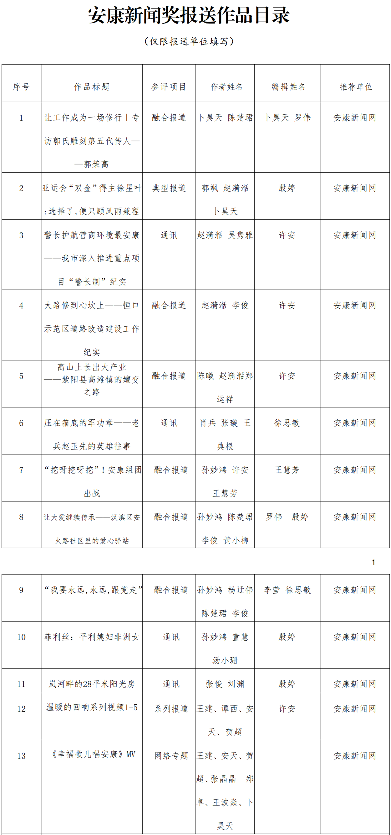 經(jīng)過編委會(huì)推薦、社黨委研究決定,擬推薦以下13件新聞作品參評(píng)2023年度“安康新聞獎(jiǎng)”。公示時(shí)間從2024年3月25日至2024年3月29日,公示期為5個(gè)工作日。如有不同意見,請向安康日報(bào)社機(jī)關(guān)紀(jì)委、新聞管理部反映。