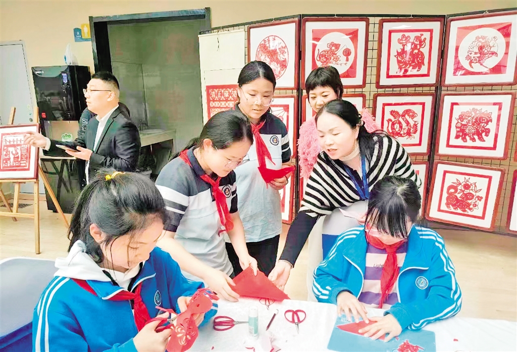 走進(jìn)張莉的課堂里,滿目色彩繽紛的剪紙作品,大大小小地陳列在展臺處。整整齊齊的桌凳圍成一個個不同形狀,以便于學(xué)生更好地進(jìn)行交流。她用學(xué)生通俗易懂的語言為學(xué)生傳授剪紙技巧:“同學(xué)們,我們首先把需要用的彩紙對折接著裁剪出合適的大小。然后再描出自己想要剪出的形狀……”通過紙張在指尖來回翻轉(zhuǎn),手中的剪刀“咔嚓咔嚓”,一幅幅美輪美奐的作品便呈現(xiàn)在眼前。每周張莉都要給學(xué)生們上幾節(jié)美術(shù)課,這也讓很多學(xué)生對剪紙產(chǎn)生了濃厚的興趣,創(chuàng)造出很多優(yōu)秀作品。