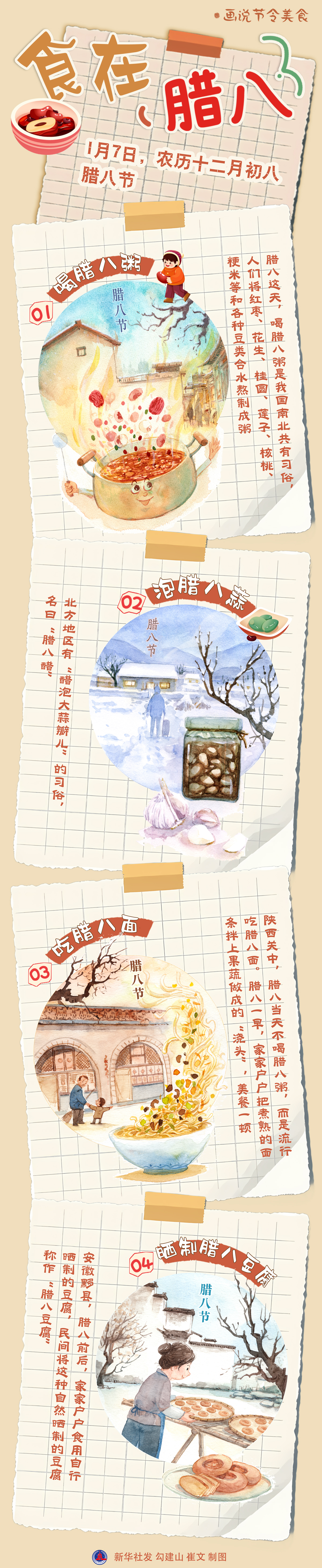 1月7日,農(nóng)歷十二月初八,是臘八節(jié)。臘八這天,喝臘八粥是我國南北共有習俗,人們將紅棗、花生、桂圓、蓮子、核桃、粳米等和各種豆類合水熬制成粥。