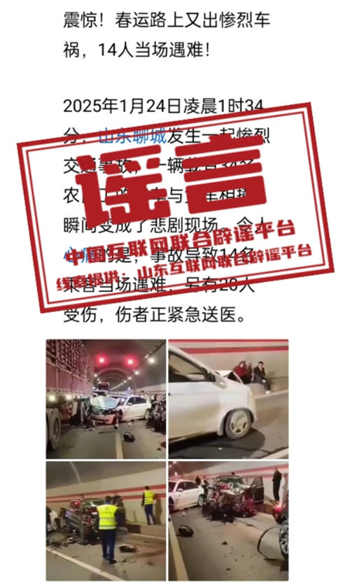 真相:近日,有網(wǎng)民在網(wǎng)絡(luò)平臺(tái)發(fā)布一則“山東聊城一隧道內(nèi)發(fā)生多車相撞”的信息,稱“現(xiàn)場多車發(fā)生嚴(yán)重碰撞,場面慘烈,群眾滯留”,引發(fā)關(guān)注。經(jīng)當(dāng)?shù)鼐胶藢?shí),山東省聊城市從未發(fā)生過類似交通事故,該信息內(nèi)容純屬虛假編造。經(jīng)查,網(wǎng)民褚某某和韓某為博取關(guān)注、吸引流量,將外省市發(fā)生交通事故的圖片視頻移花接木,稱“聊城發(fā)生交通事故”并憑空捏造傷亡人數(shù),造成不良影響。目前,二人已被公安機(jī)關(guān)依法打擊處理。(來源:山東互聯(lián)網(wǎng)聯(lián)合辟謠平臺(tái)、聊城市網(wǎng)上辟謠平臺(tái))
