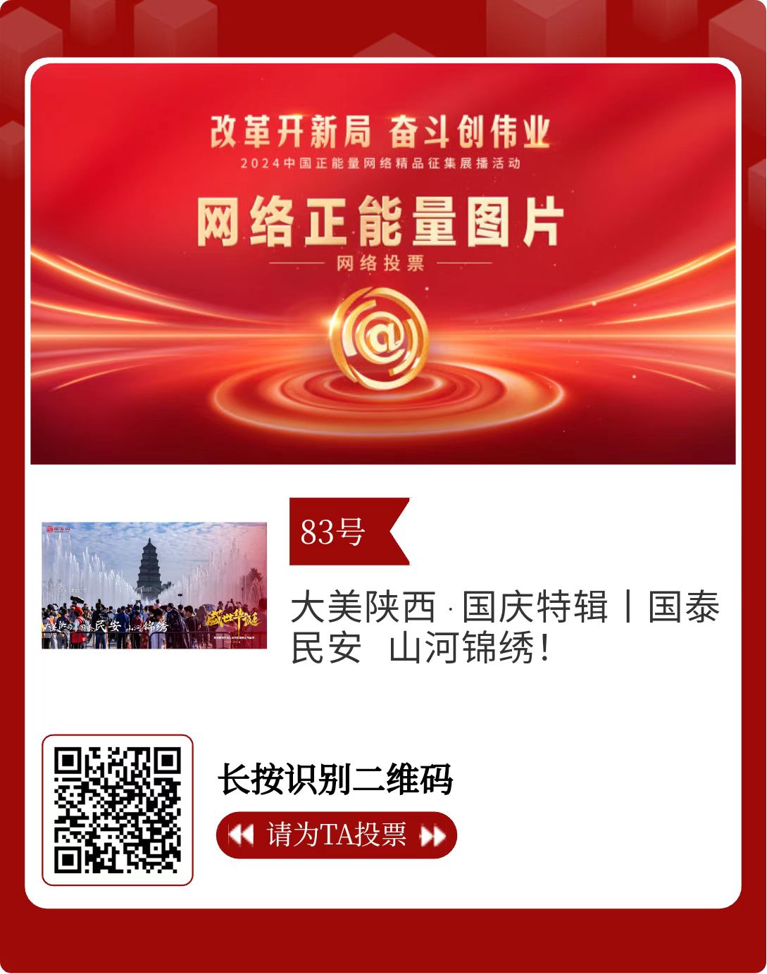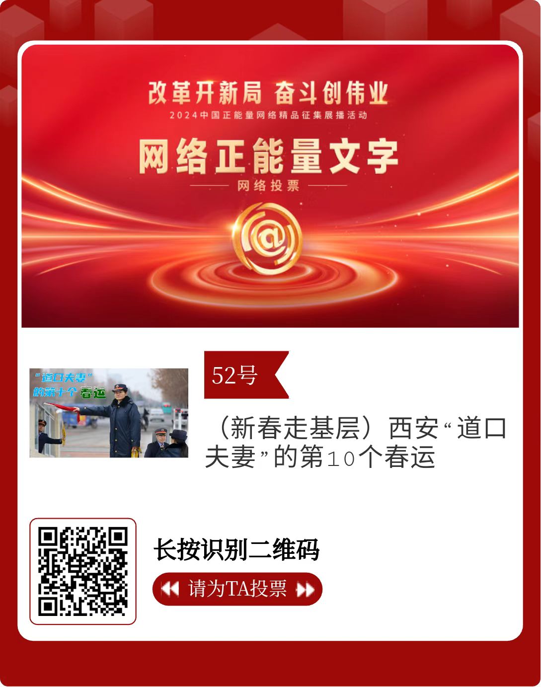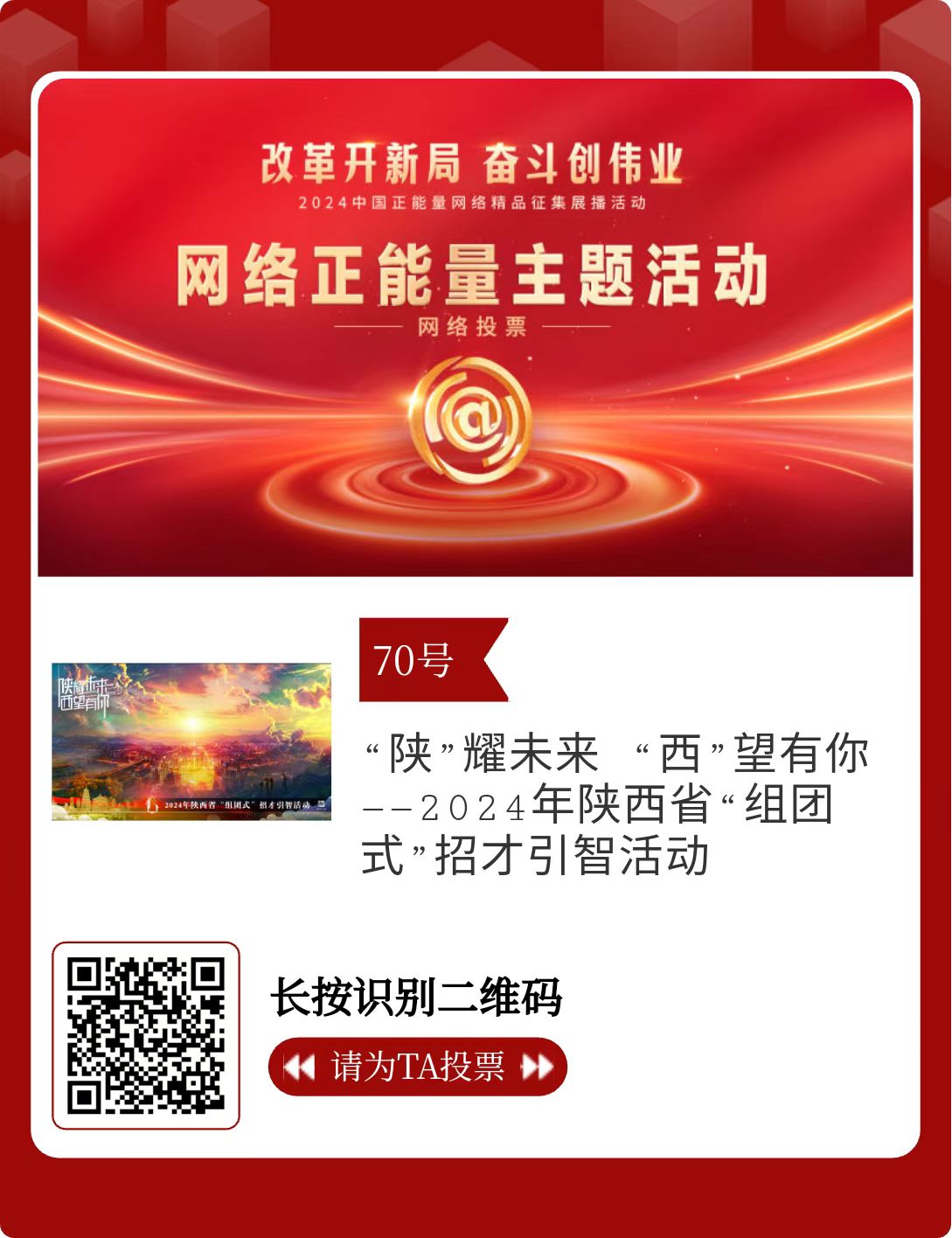 陜西省32件作品進(jìn)入投票環(huán)節(jié),投票時間為2月15日至2月21日,投票結(jié)果將作為中國正能量網(wǎng)絡(luò)精品遴選的重要參考。中國正能量網(wǎng)絡(luò)精品,期待每一個充滿正能量的你投出點(diǎn)贊一票。