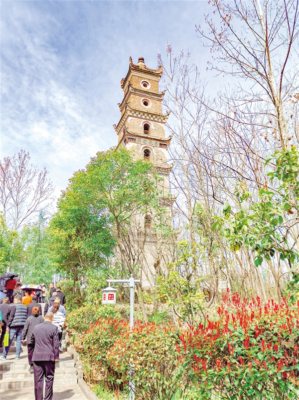 這時,塔側(cè)傳來歡快的鑼鼓聲,循聲望去,是一段十幾米的孝義文化長廊,一組男女或站或坐敲打著響器,使奠安塔不再寂寞。廊道的另一頭連接著奠安公園,環(huán)形觀景步道上擠滿了游覽的人。春分時節(jié),杏花正在萌發(fā),桃花含苞待放,倒是紅葉李花開正艷,細小如甲的花瓣布滿枝頭,零落軟泥上,雪白一片,仿佛成了李花的世界。舉目四望,花草清新,小學生在撿拾垃圾,胸前的紅領巾在陽光的照射下熠熠生輝,與周遭綠植映襯,絢爛了滿園春色。