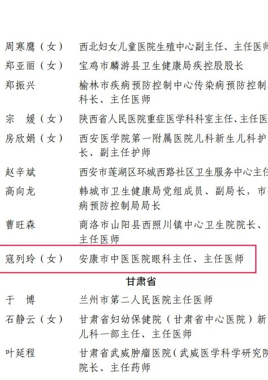 寇列玲,女,漢族,1975年10月生,陜西黃陵人,中共黨員,主任醫(yī)師,現(xiàn)任安康市中醫(yī)醫(yī)院眼科主任。該同志醫(yī)術(shù)精湛,服務(wù)患者耐心細(xì)致,心系社會(huì),開展近視防控公益行進(jìn)校園100余次,行程20萬(wàn)公里,篩查學(xué)生10余萬(wàn)人,受益學(xué)生50余萬(wàn)人,解除安康山區(qū)數(shù)以萬(wàn)計(jì)眼病患者痛苦,避免因盲致貧、因殘致貧。帶領(lǐng)眼科團(tuán)隊(duì)銳意進(jìn)取,眼科入選國(guó)家區(qū)域診療中心培育單位、國(guó)家中醫(yī)優(yōu)勢(shì)??平ㄔO(shè)項(xiàng)目、陜西省區(qū)域診療中心。參與國(guó)家中醫(yī)藥管理局《前部缺血性視神經(jīng)病變》臨床指南制修訂,完成省中醫(yī)藥管理局十大病種《玻璃體積血》《消渴目病》創(chuàng)新項(xiàng)目,取得陜西省科技成果三等獎(jiǎng)2項(xiàng),被評(píng)為安康市第四屆十佳醫(yī)生稱號(hào),榮獲安康市十佳科技青年獎(jiǎng),被評(píng)為安康市有突出貢獻(xiàn)專家,入選“西部之光”訪問(wèn)學(xué)者。