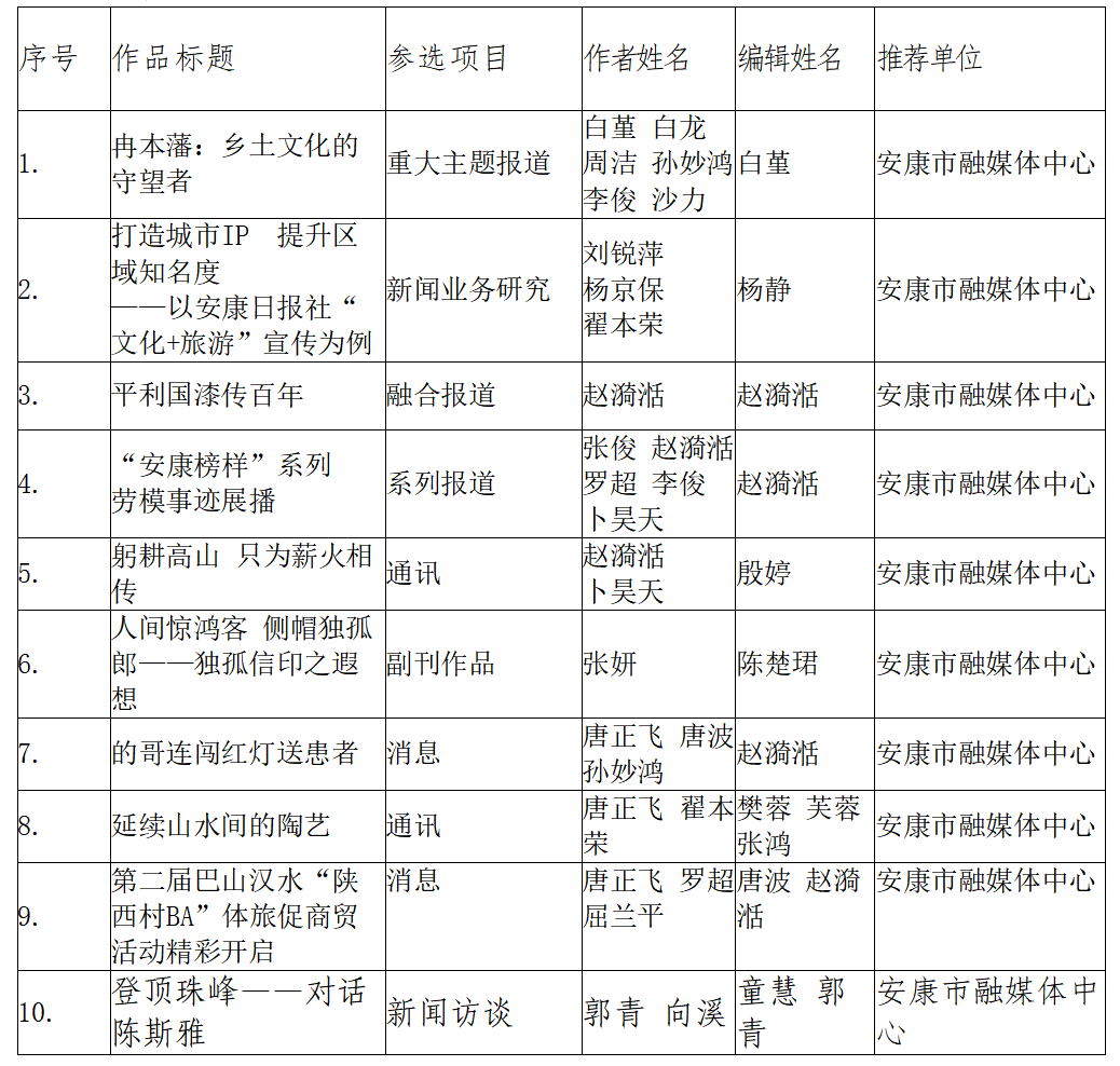 附件:安康優(yōu)秀新聞作品報送目錄(補充)(共計10件)