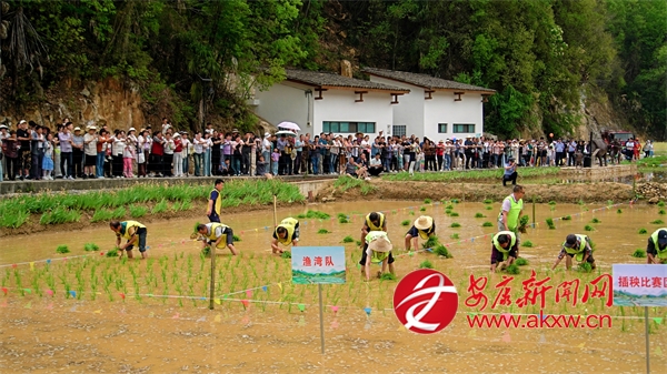 10點(diǎn)50分,插秧比賽正式開始,只見寨溝村、龍泉村、漁灣村、湯坪村四支隊(duì)伍在水田中依次排開。 隨著清脆的哨響,四支插秧隊(duì)伍迅速進(jìn)入狀態(tài),水田瞬間化作激烈的賽場。彎腰俯身,左手攥緊秧苗,右手分秧、插秧,一株株嫩綠的秧苗被精準(zhǔn)插入田中,泥水飛濺間,選手們你追我趕,汗水與歡笑交織,將傳統(tǒng)農(nóng)事活動(dòng)演繹成了一場精彩絕倫的視覺盛宴。