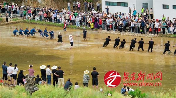 插秧比賽后緊接著開展了拔河比賽,參賽者們光著腳在泥濘的田里奮力拉扯,你來我往,互不相讓,田邊的觀眾則奮力地為自己支持的隊(duì)伍加油鼓勁。稻田抓鴨捕魚活動(dòng)讓現(xiàn)場氣氛更加熱烈,觀眾紛紛脫下鞋襪,卷起褲腿,在稻田中追逐游魚和鴨子,歡快的笑聲此起彼伏。?