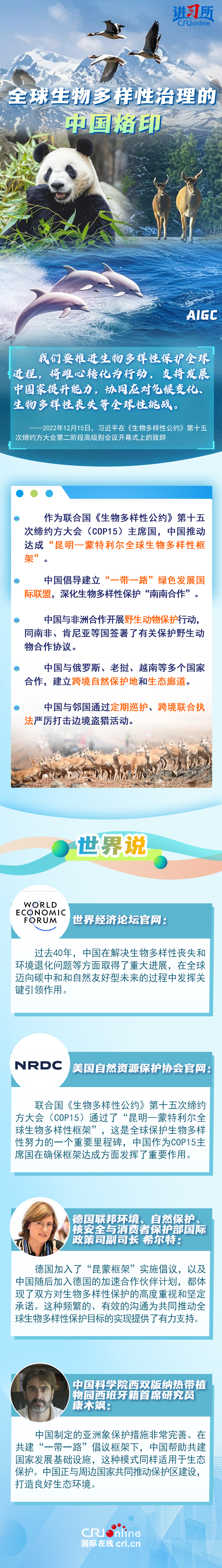 “心往一處想、勁往一處使,共建地球生命共同體?!弊鳛樽钤绾炇?、批準(zhǔn)《生物多樣性公約》的締約方之一,生物多樣性保護(hù)已經(jīng)上升為中國(guó)的國(guó)家發(fā)展戰(zhàn)略。國(guó)際人士表示,中國(guó)的一系列舉措體現(xiàn)出對(duì)生態(tài)環(huán)境保護(hù)的堅(jiān)定決心,同時(shí),中國(guó)依托共建“一帶一路”倡議等國(guó)際合作機(jī)制,為推動(dòng)全球生物多樣性保護(hù)提供了有力支持,在邁向自然友好型未來(lái)的過(guò)程中發(fā)揮關(guān)鍵的引領(lǐng)作用。