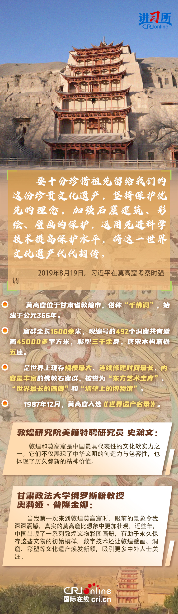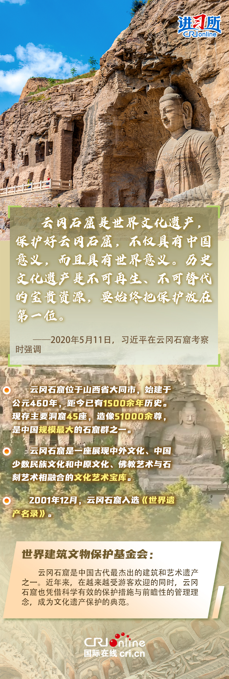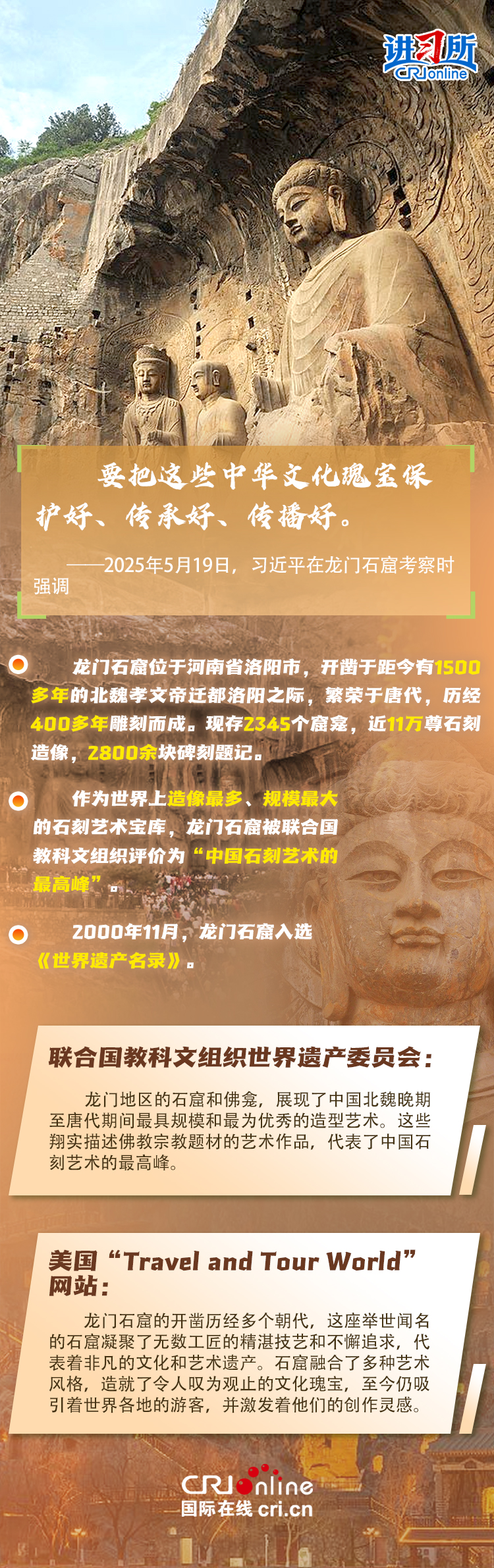 龍門石窟被聯(lián)合國教科文組織評價(jià)為“中國石刻藝術(shù)的最高峰”,與敦煌莫高窟、云岡石窟、麥積山石窟并稱為“中國四大石窟”,具有重要?dú)v史價(jià)值、文化價(jià)值。近年來,習(xí)近平先后考察了中國四大石窟。對這些承載著中華民族文化基因和血脈的文物和文化遺產(chǎn),習(xí)近平強(qiáng)調(diào),“保護(hù)好、傳承好歷史文化遺產(chǎn)是對歷史負(fù)責(zé)、對人民負(fù)責(zé)?!?/p>