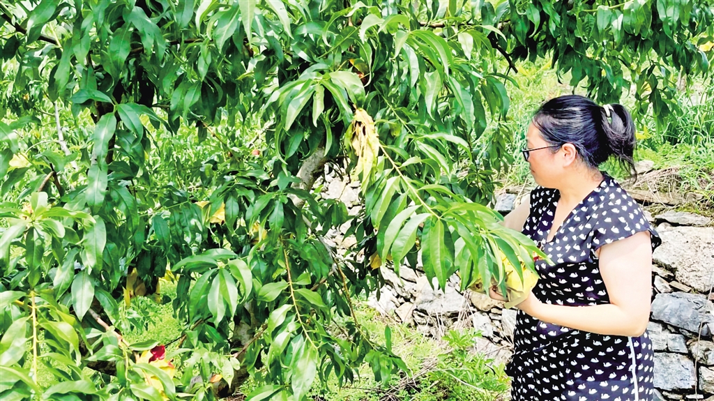 穿過村莊,山坡上500畝桃園綠意盎然。基地負責人伍娟與工人正采摘套袋?!?017年建設的桃園,今年雖受旱情影響,產量仍達30萬斤,產值約300萬元?!?o:p>