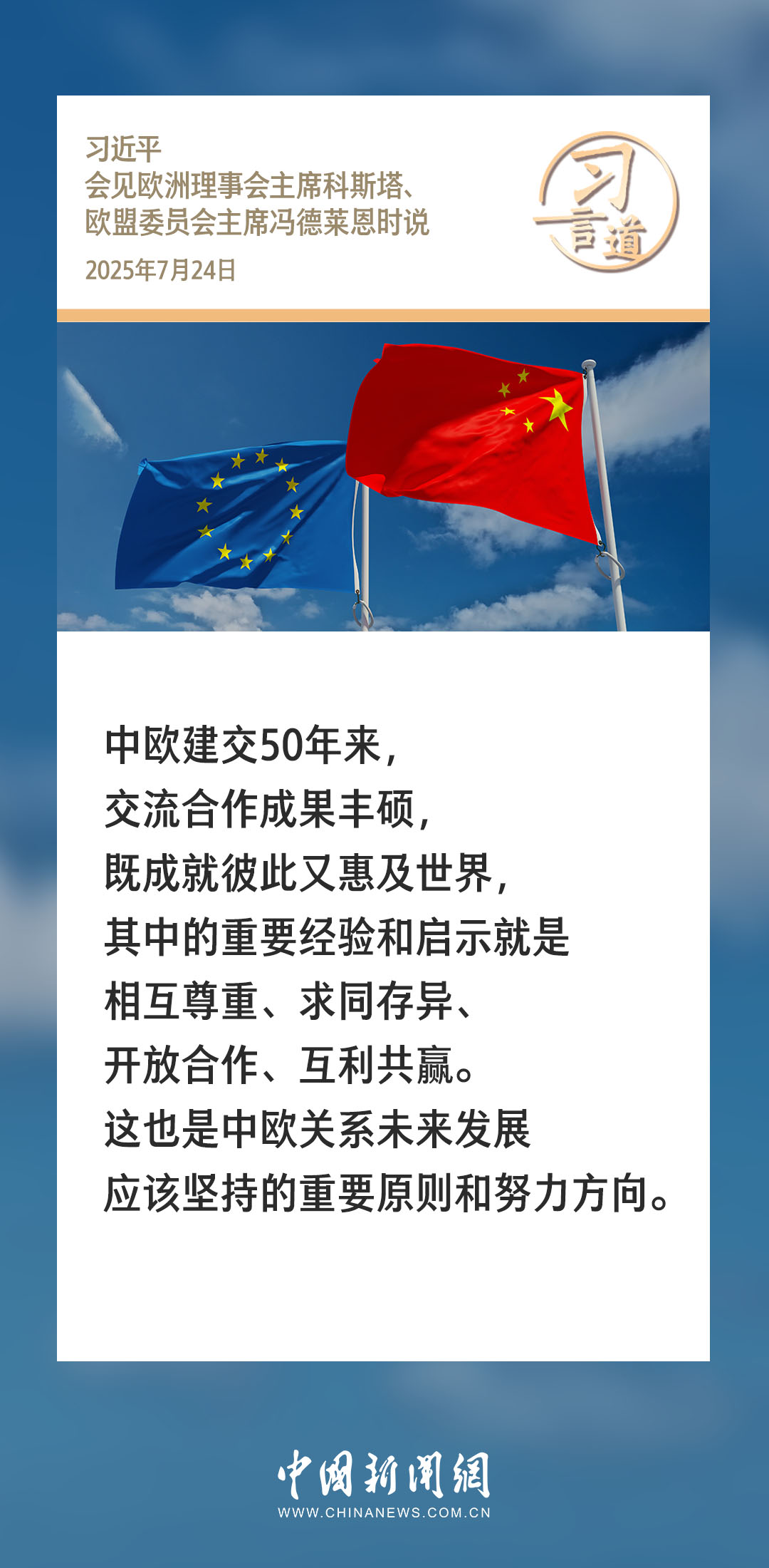 7月24日,國家主席習近平在北京人民大會堂會見來華舉行第二十五次中國-歐盟領(lǐng)導人會晤的歐洲理事會主席科斯塔和歐盟委員會主席馮德萊恩。習近平指出——