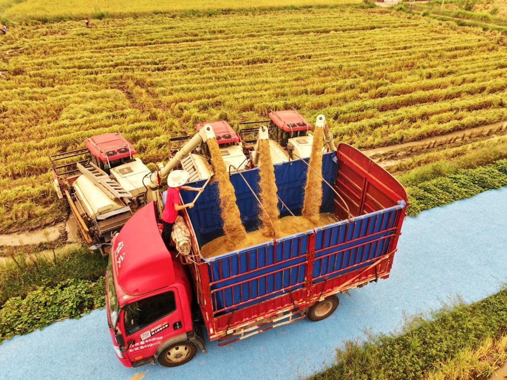 近日,四川省達州市渠縣有慶鎮(zhèn)太陽村農民轉運剛收獲的水稻(無人機照片)。白露節(jié)氣之際,各地農民搶抓農時,田間地頭一片農忙景象。新華社發(fā)(鄧良奎 攝)
