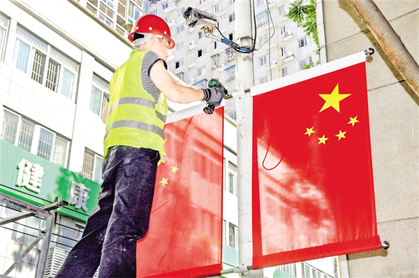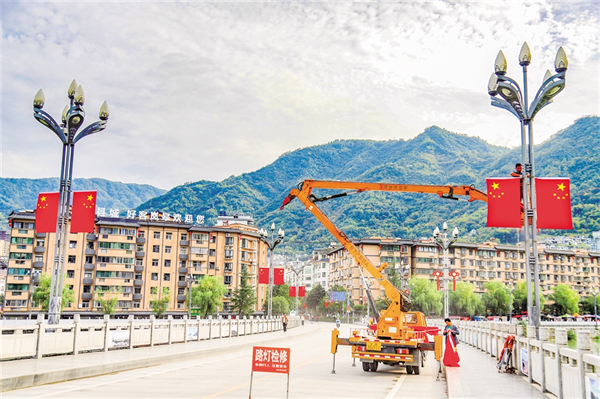 9月25日,紫陽縣城區(qū)橋溝路的大道上,工人正在懸掛國(guó)旗。?