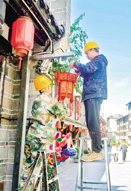 9月24日,石泉縣積極籌備國(guó)慶黃金周旅游服務(wù)保障工作。圖為石泉縣漢江古城景區(qū),工作人員正在更換景觀燈。?