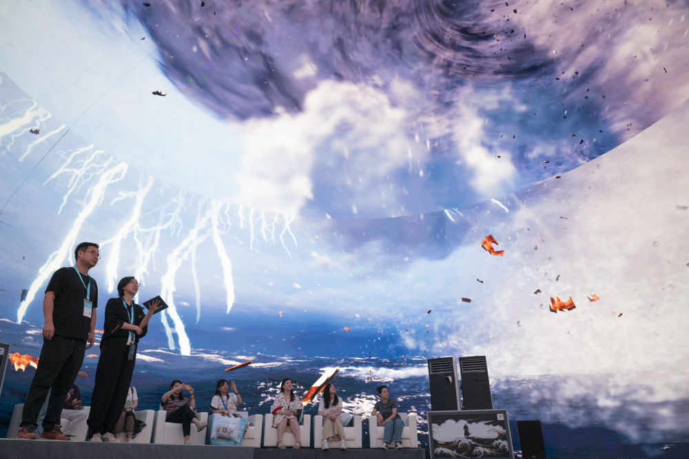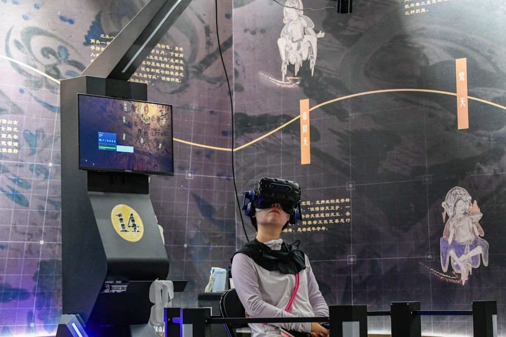 2024年7月22日,游客在“尋境敦煌——數(shù)字敦煌沉浸展”借助VR設(shè)備沉浸式游覽莫高窟第285窟虛擬場景。“尋境敦煌——數(shù)字敦煌沉浸展”綜合運(yùn)用VR虛擬現(xiàn)實(shí)、三維建模、游戲引擎的物理渲染和全局動(dòng)態(tài)光照等新技術(shù),高精度立體還原了莫高窟第285窟。游客戴上VR眼鏡,不僅可以零距離觀賞壁畫、360度自由探索洞窟細(xì)節(jié),還能“飛升”到窟頂,身臨其境參與壁畫故事情節(jié),沉浸式感受敦煌文化的魅力。