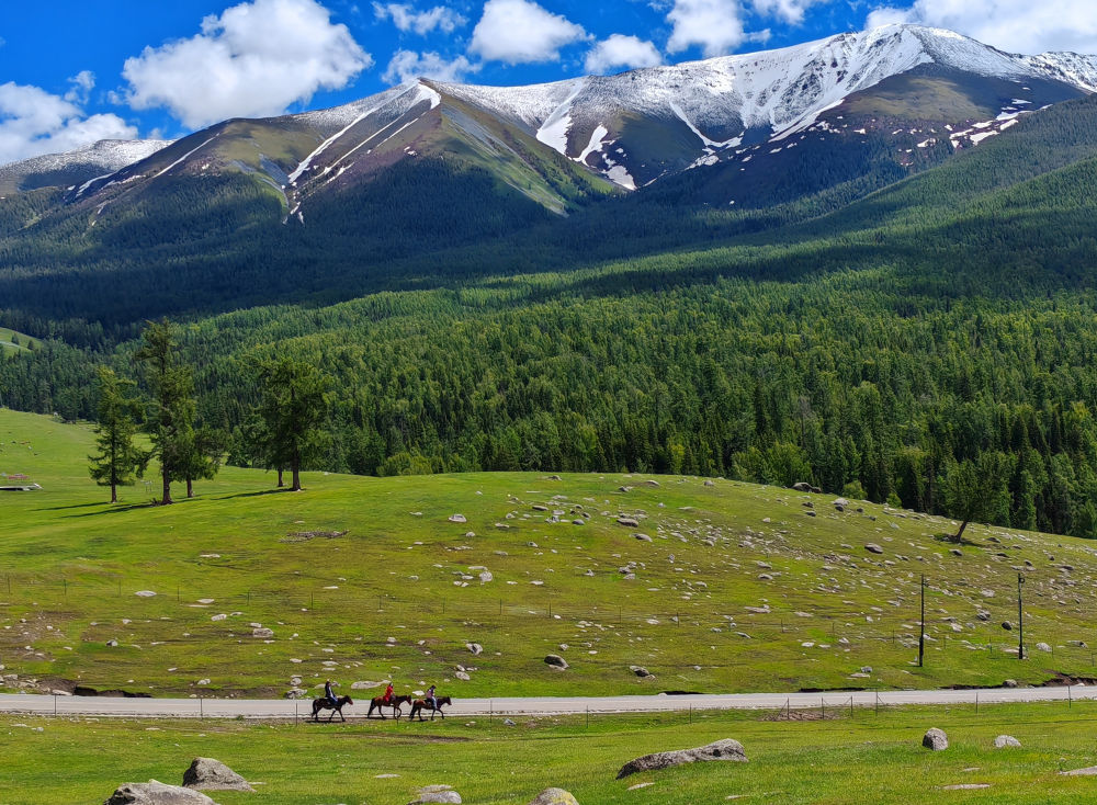 2024年6月4日,游客在新疆阿勒泰地區(qū)哈巴河縣騎馬游玩。電視劇《我的阿勒泰》播出后,新疆阿勒泰地區(qū)迎來客流高峰,“張鳳俠的小賣部”“巴太樹”“彩虹布拉克”等劇中地點(diǎn)成為熱門旅游打卡地。這場“邊城”與“熱劇”雙向奔赴的文旅盛宴,為當(dāng)?shù)亟?jīng)濟(jì)發(fā)展帶來新的增長點(diǎn)。2024年5月,當(dāng)?shù)亟哟慰?15.03萬人次,同比增長60.81%;實(shí)現(xiàn)旅游收入36.53億元,同比增長88.25%。