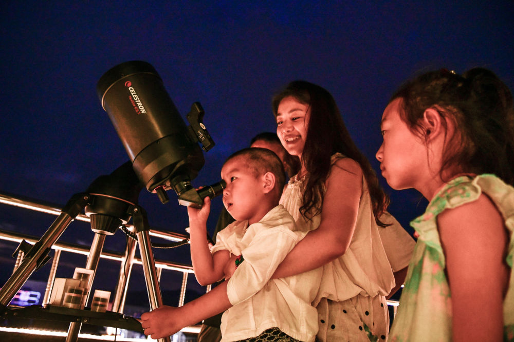 2025年7月9日,游客在貴州省平塘縣克度“天文小鎮(zhèn)”通過望遠(yuǎn)鏡觀測(cè)星空。近年來,隨著旅游設(shè)施逐漸完善,距離“中國天眼”僅8公里的克度“天文小鎮(zhèn)”通過“科普+文旅”發(fā)展模式,帶動(dòng)村民就業(yè)創(chuàng)業(yè)、增收致富。2025年1月至6月,“中國天眼”景區(qū)共接待游客約38萬人次,總收入2496萬余元。
