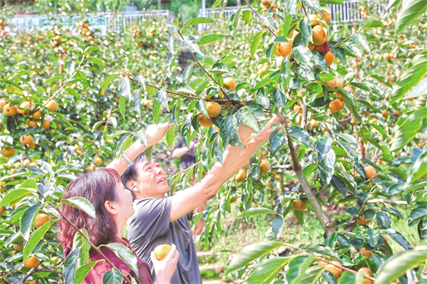 10月8日,游客在石泉縣城關鎮(zhèn)絲銀壩村脆甜柿子果園體驗采摘樂趣。許兵 攝
