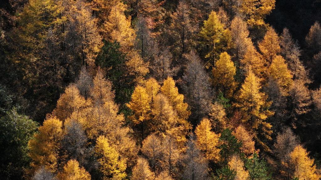 位于六盤山西麓的寧夏固原市西吉縣大寨山林場(chǎng)秋景(無(wú)人機(jī)照片)。新華社記者 楊植森 攝