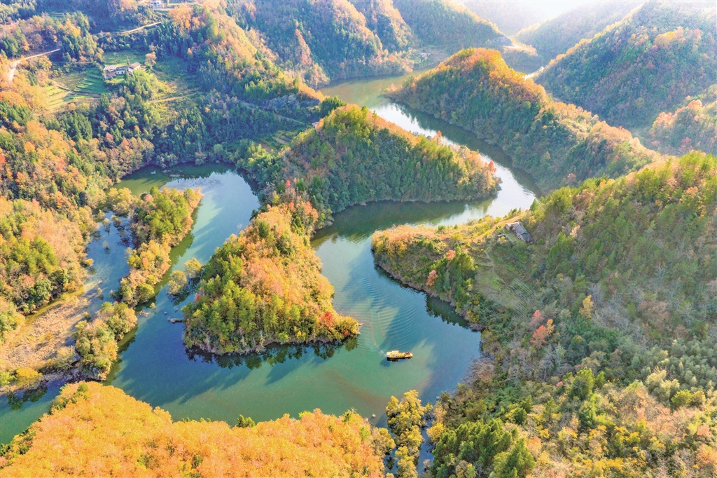 夕陽(yáng)下的沙坪河,斑斕山林與澄澈水色繪就成一幅靈動(dòng)的水鄉(xiāng)畫(huà)卷。郭浩 攝