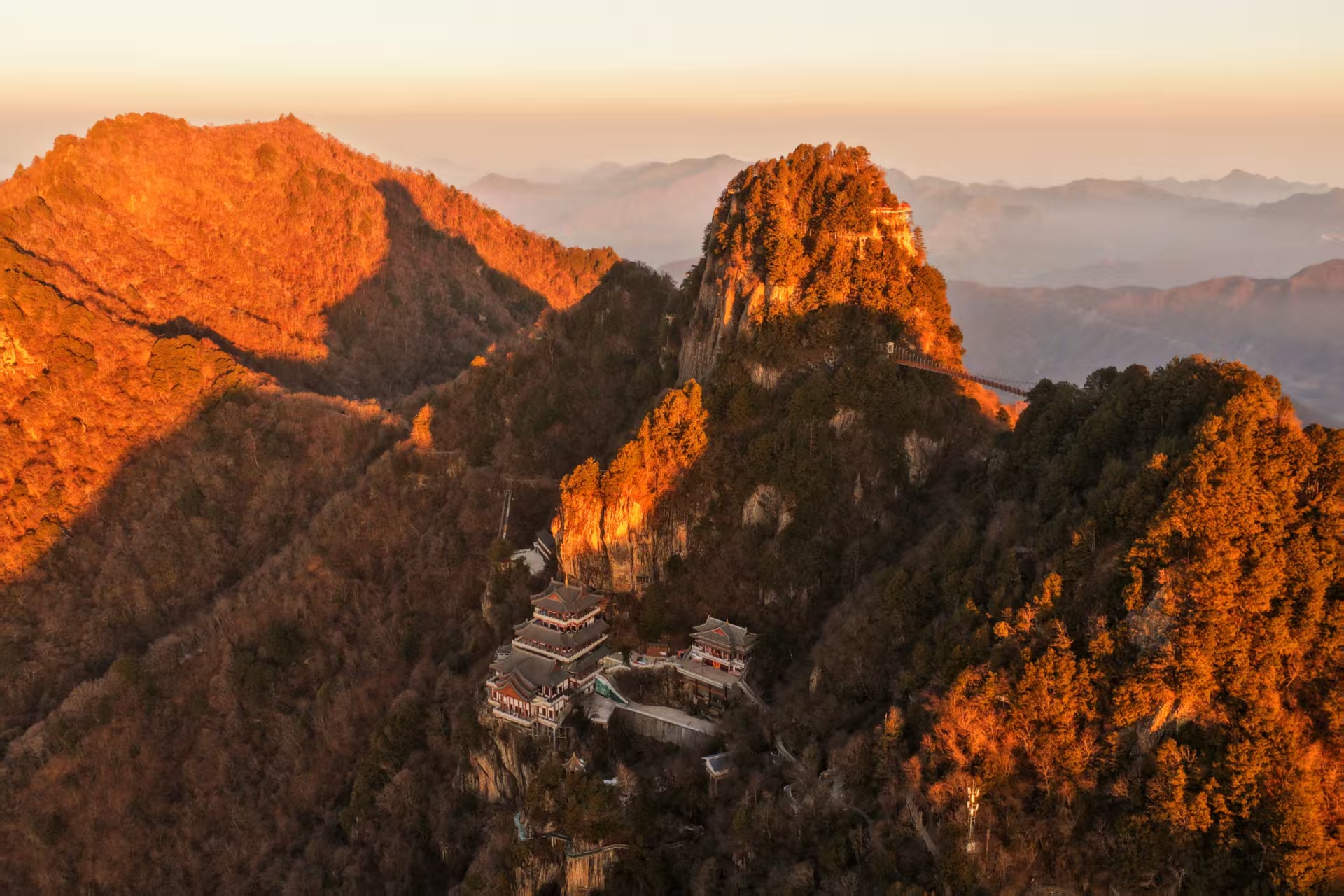 冬日清晨,登高俯瞰嵐皋縣南宮山景區(qū),群峰籠罩于晨霧之中。朝陽映照下,連綿山體泛起赤紅光暈,盡顯地質(zhì)景觀的雄渾壯闊。