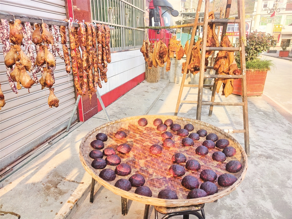 城關(guān)鎮(zhèn)作為漢陰縣的農(nóng)業(yè)大鎮(zhèn)與文旅活鎮(zhèn),轄區(qū)內(nèi)30個(gè)村(社區(qū))的農(nóng)戶們,把冬腌臘肉視作過年的重要儀式?!靶⊙┻^后腌臘肉,開春都香!”平安村村民李師傅笑著介紹,他家養(yǎng)的本地土豬是吃野菜、粗糧長大的,肉質(zhì)緊實(shí)肥瘦相間,是成就臘味醇香的基礎(chǔ)。每年他都會(huì)沿襲祖輩的制作工藝,將新鮮五花肉和后腿肉,用麻繩系好瀝干水分,再用粗鹽混合本地花椒、八角等香料逐塊揉搓,確保味道滲進(jìn)肌理,然后將腌好的肉壓上青石板,在陰涼通風(fēng)處靜置三五天,每日翻動(dòng)保證均勻入味,再經(jīng)過二十天的晾曬,方可完成。制好的臘肉切開后瘦肉呈瑪瑙紅色,肥肉如琥珀色,香氣撲鼻。