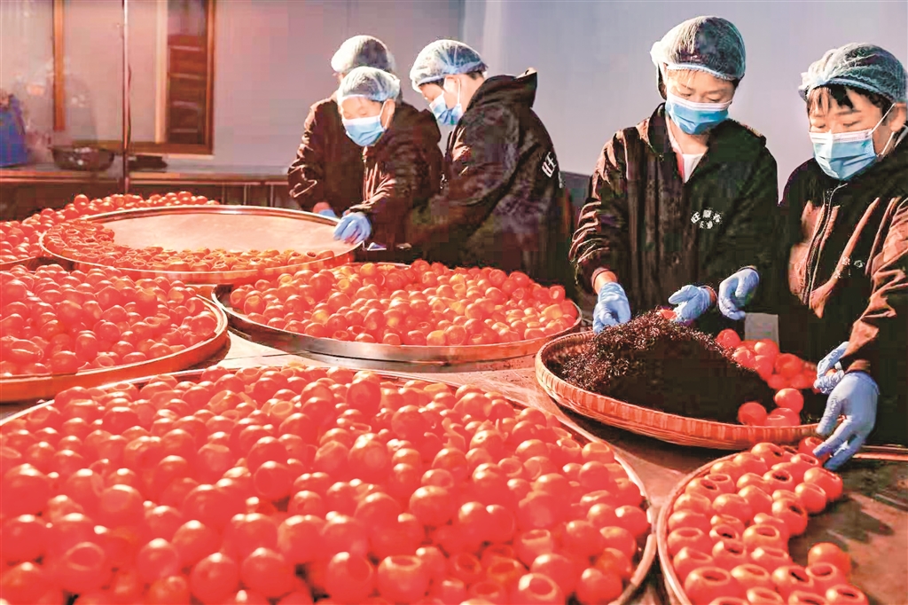 生產車間內,工人們動作嫻熟,選果、清洗、開蓋、掏挖果肉、填茶、烘干……每一道工序都有條不紊。他們大都是附近的村民,本是茶葉生產的淡季,如今卻因為小橘茶變成了增收的旺季。