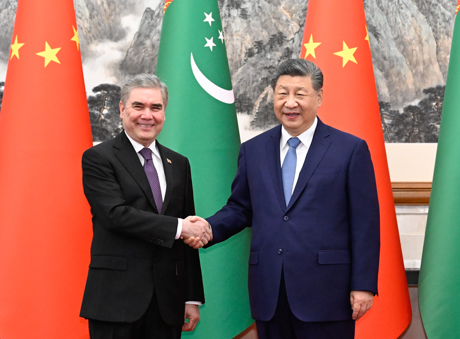 3月18日下午,國(guó)家主席習(xí)近平在北京釣魚(yú)臺(tái)國(guó)賓館會(huì)見(jiàn)來(lái)華進(jìn)行友好訪(fǎng)問(wèn)的土庫(kù)曼斯坦民族領(lǐng)袖、人民委員會(huì)主席別爾德穆哈梅多夫。新華社記者 申宏 攝