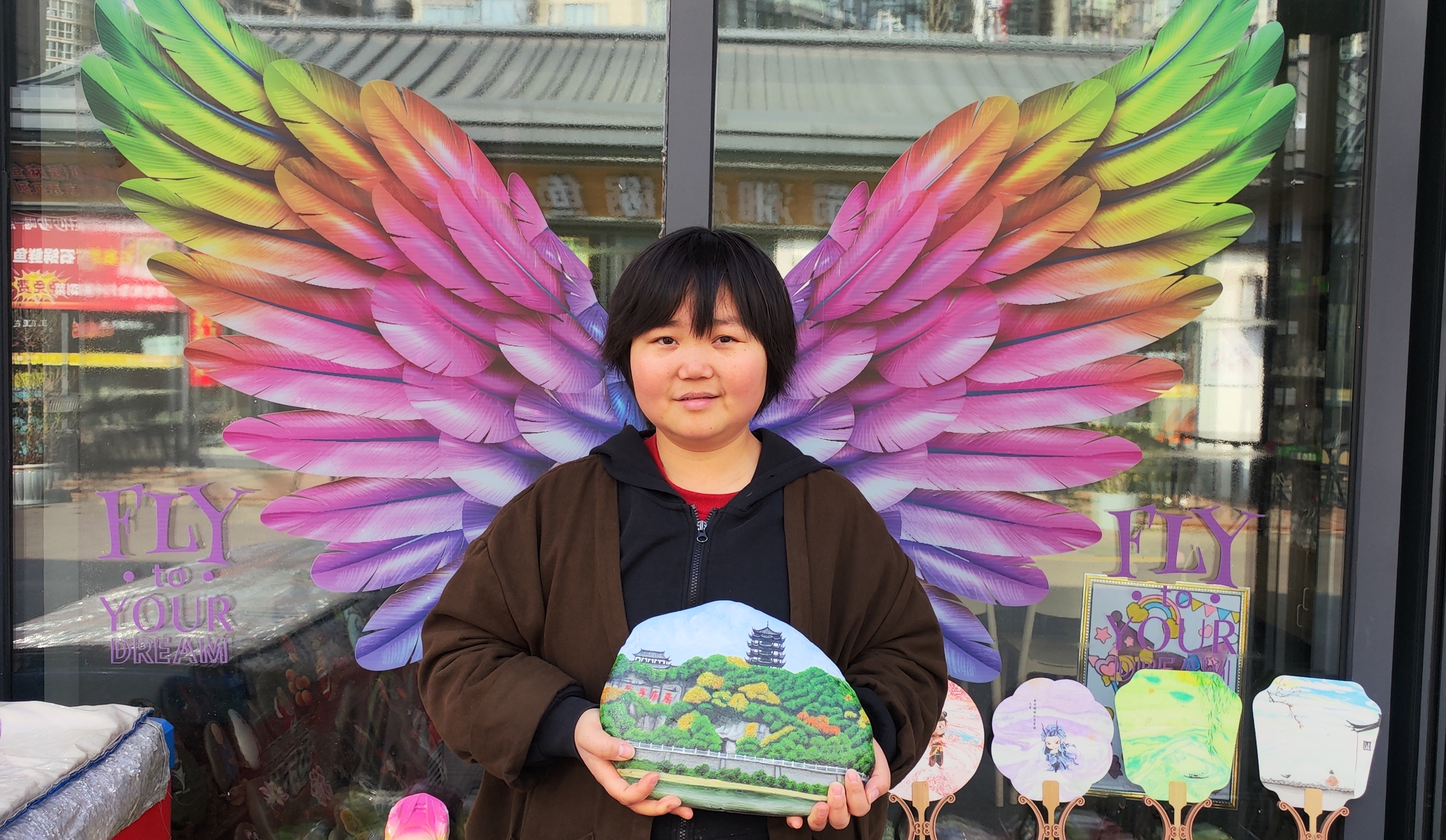 在她店鋪門口的玻璃柜上,貼著一雙展開的彩翼,手捧石頭畫的李景麗,眼神明亮、笑容溫婉,恰似破繭重生的蝴蝶,歷經(jīng)風(fēng)雨洗禮,依舊振翅翱翔,用手中的畫筆續(xù)寫著屬于自己的芳華,也用堅(jiān)韌與熱愛,詮釋著新時(shí)代普通人不屈不撓、逐光前行的精神力量。