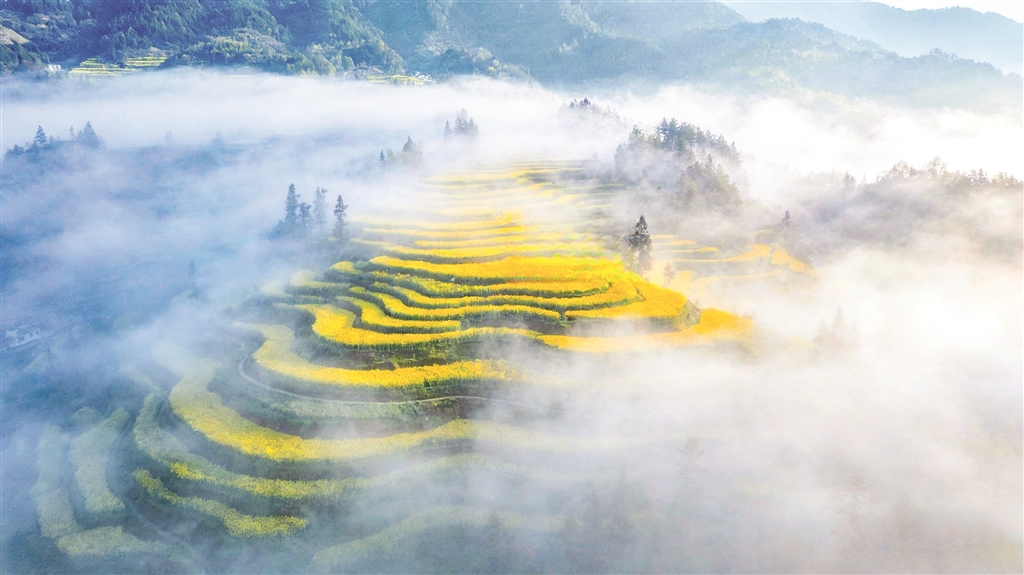 沿著蜿蜒的山路盤旋而上,轉(zhuǎn)過一個山坳,眼前豁然開朗——那金黃的油菜花,竟從山腳一直鋪到云端。層層疊疊的梯田,依著山勢盤旋而上,每一道田埂都勾勒出柔美的曲線。油菜花便順著這些曲線,開得浩浩蕩蕩,開得理直氣壯。晨霧未散時,花海在薄紗般的霧氣里若隱若現(xiàn),恍若仙境;待太陽升高,霧氣褪去,那金黃便愈發(fā)耀眼,直晃得人瞇起眼睛。風過處,花浪翻涌,從這山傳到那山,沙沙的聲響里,滿是春天的氣息。