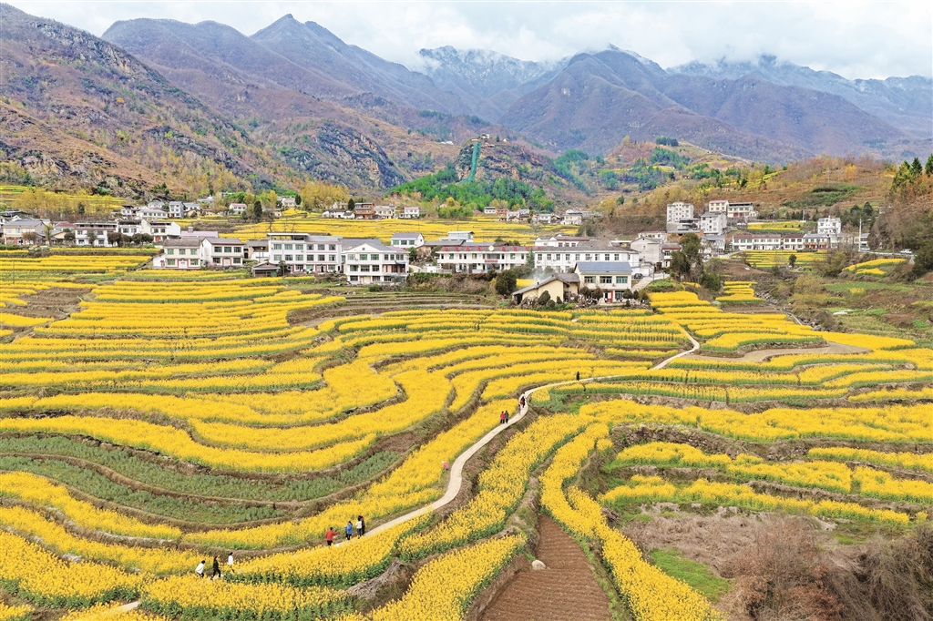 3月18日,鳳凰山巔殘雪未融,山下鳳堰梯田油菜花已進入盛花期。 陳軍 攝