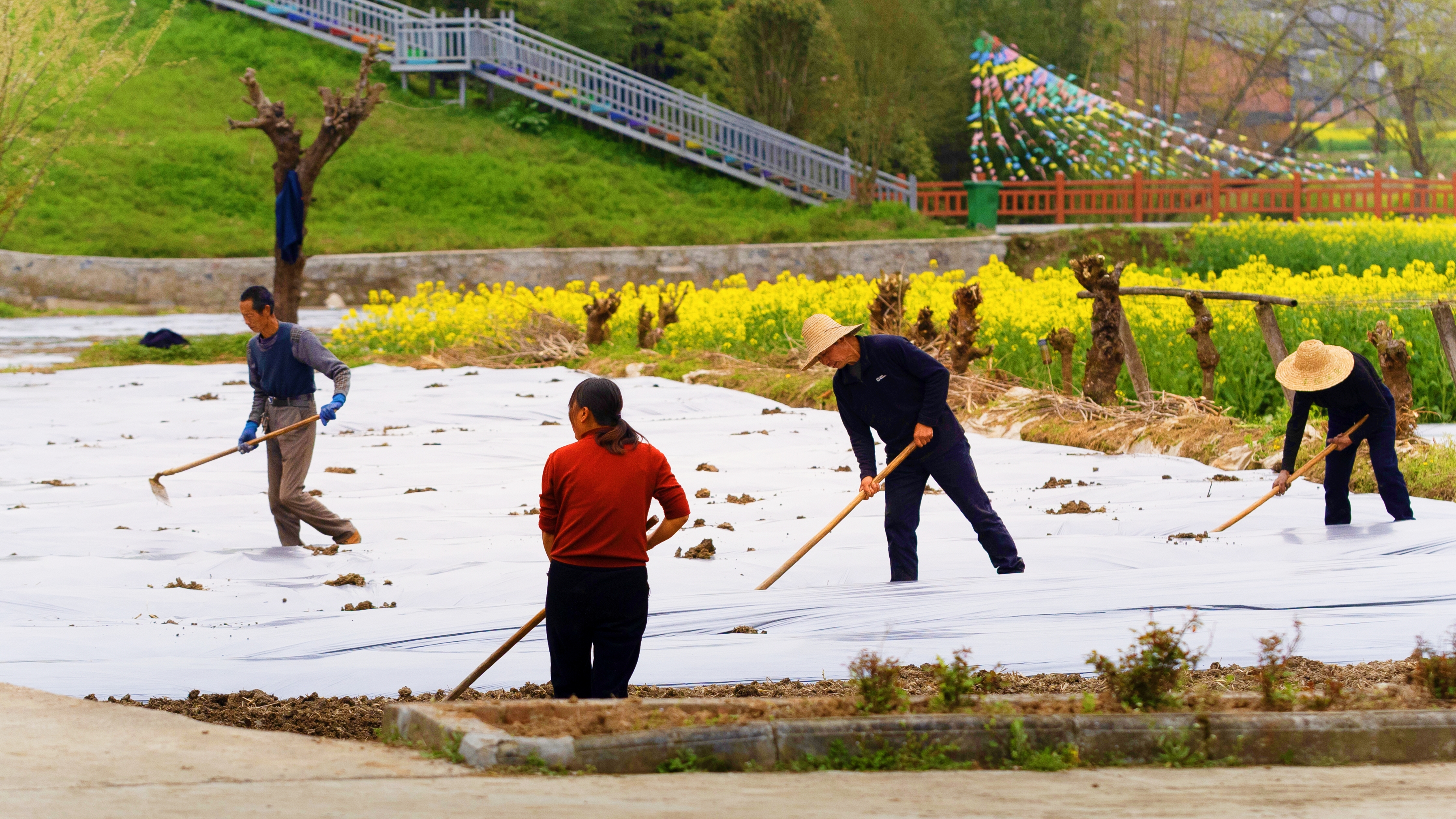 花海之上風(fēng)光旖旎,花海之下農(nóng)事正忙。趁著晴好天氣,當(dāng)?shù)剞r(nóng)戶搶抓春耕有利時節(jié),田間地頭一派熱火朝天的忙碌景象。大家分工協(xié)作、有條不紊,忙著起壟整地、鋪設(shè)地膜,為紫長茄子移栽做前期準(zhǔn)備工作。