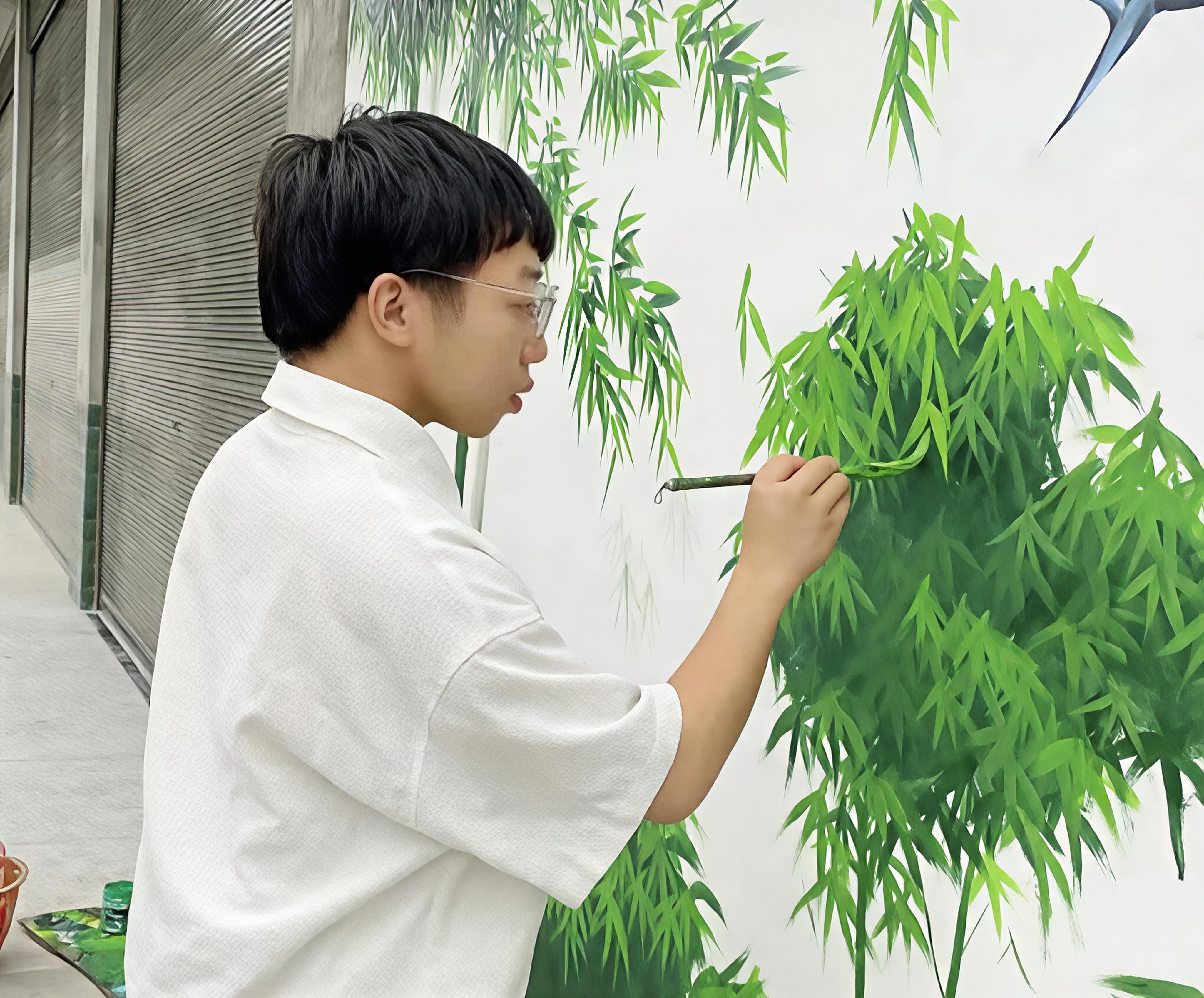 張家壩村,1998年出生的游乙山正蹲在墻角專注創(chuàng)作,不多時(shí),一面栩栩如生的文化墻便呈現(xiàn)眼前,與青山綠水、整潔街道相映成趣,勾勒出鄉(xiāng)村振興的美好畫(huà)卷。這位土生土長(zhǎng)的正陽(yáng)青年,畢業(yè)于湖南文理學(xué)院,憑借扎實(shí)繪畫(huà)功底,在鄰縣創(chuàng)辦“藝山美學(xué)館”,從事美術(shù)培訓(xùn)和墻體彩繪。