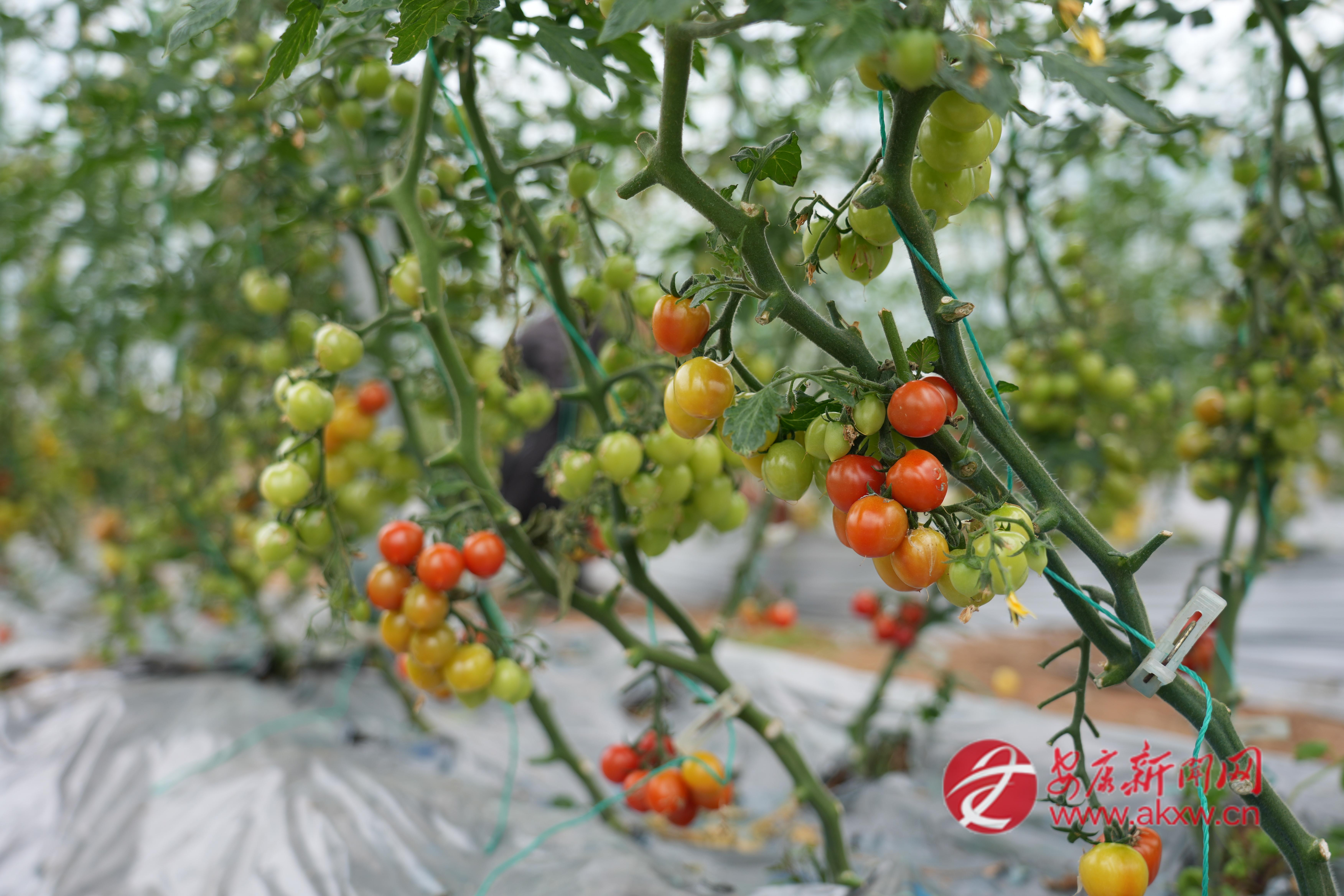 春日暖陽普照田園,產(chǎn)業(yè)園標(biāo)準(zhǔn)化種植大棚里綠意蔥蘢,清新果香彌漫其間。一排排番茄藤蔓長勢繁茂,紅、黃、綠、紫、白、焦糖等六色果實綴滿枝頭,圓潤飽滿、色澤鮮亮,宛如一顆顆彩色珍珠鑲嵌在綠葉間,格外惹人喜愛。
