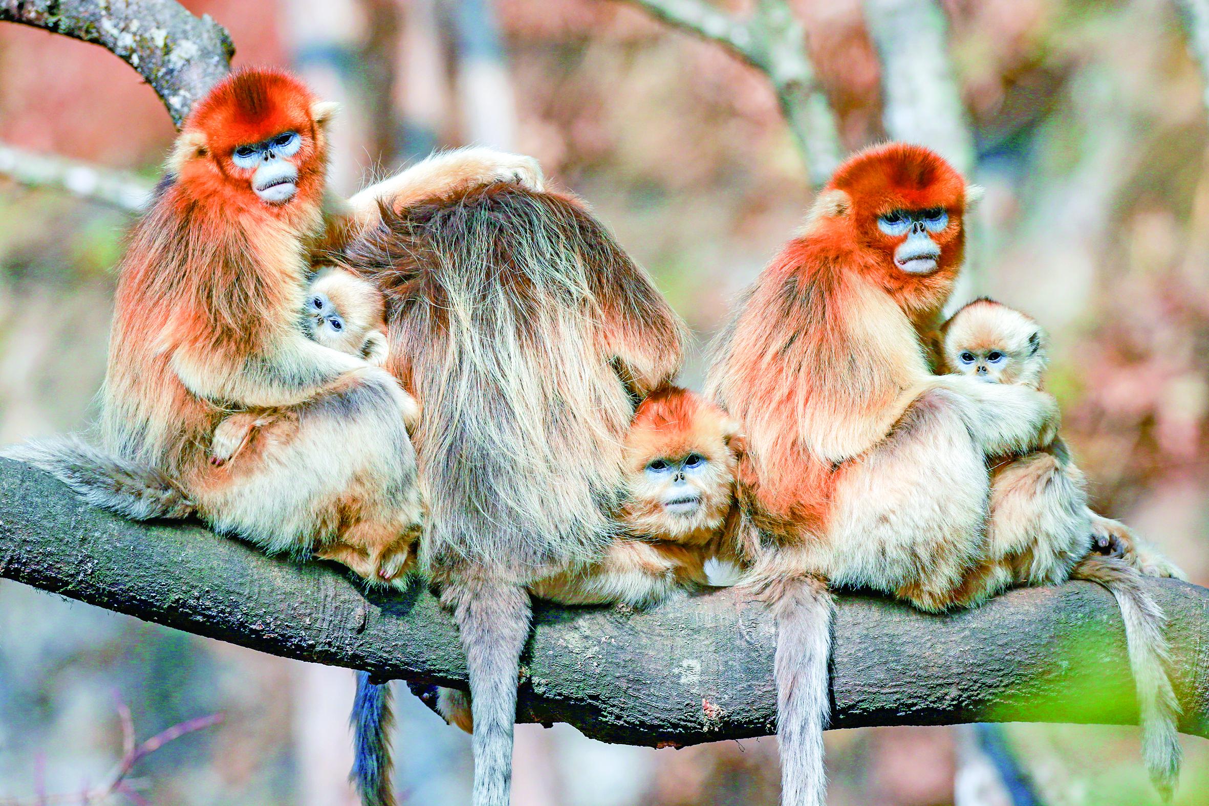 川金絲猴喜群棲生活,是典型的群居動物,一個猴群通常由幾十只甚至幾百只猴子組成。而每個大的集群按家族性的小集群為活動單位,每個小集群由1只強健的成年雄性個體為首領(lǐng)搭配3-5只雌猴及3歲以下的幼猴組成。一般情況下,川金絲猴猴群由兩類單元組成,一類是以一雄多雌的小家庭為單位的多家庭單元,另一類是由單身雄性個體組成的全雄單元。其社群中存在等級序列,在一雄多雌單元內(nèi)主雄地位最高,成年雌性次之,最低的為亞成年雌性和青少年猴,但川金絲猴的等級并非嚴格。族群內(nèi)部和睦友善,個體間互相理毛、依偎相伴,極少發(fā)生沖突。川金絲猴的社會主要是以母系一雄多雌為基本社會單元的重層結(jié)構(gòu)。家庭成員之間相互呵護關(guān)照,一起覓食休息,家庭中的成年雄猴承擔著保護家庭的責任,時刻保持著高度警覺,準備驅(qū)逐來犯之敵;成年的雌猴母性很強,對幼猴都十分愛憐,特別對新出生小猴的照顧是無微不至的,雌猴們互相幫助,讓幼仔們在出生后能夠快速發(fā)育。它們依靠多樣叫聲、肢體動作完成交流,傳遞警戒、親昵等各類行為信號。