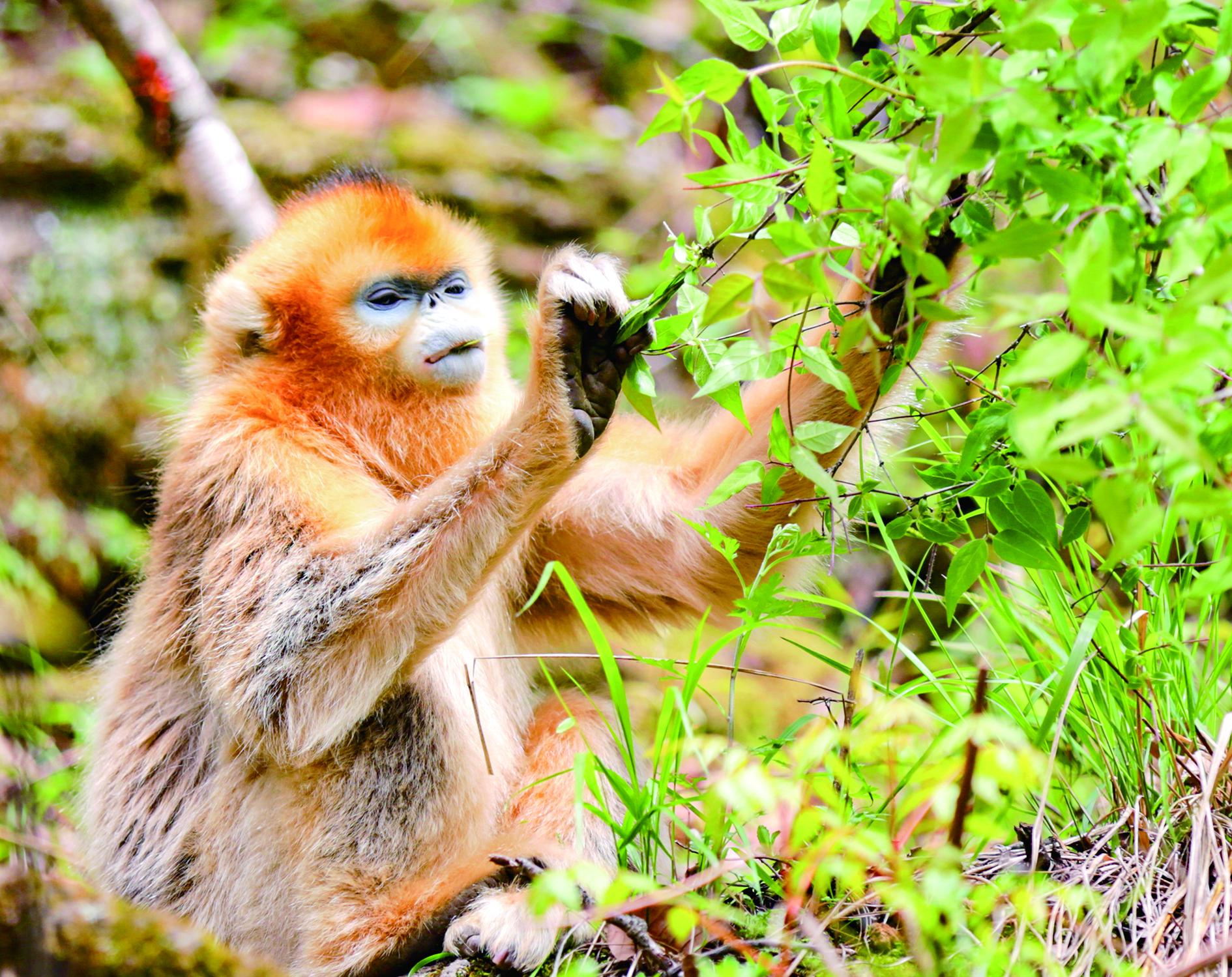 作為典型林間素食動物,金絲猴飲食結(jié)構(gòu)天然健康。日常主要取食樹葉、嫩枝嫩芽、山野花卉、野生果實、鮮嫩竹筍,冬季食物匱乏時,也會啃食樹皮、樹根、堅果充饑,極少捕食昆蟲、鳥蛋補充少量蛋白質(zhì)。其胃部特殊分區(qū)結(jié)構(gòu),可高效消化植物粗纖維,適配山林天然食源。