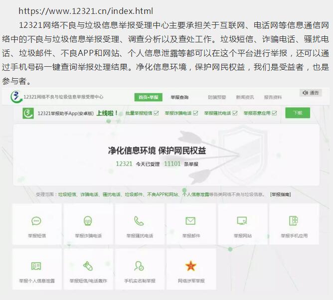 12321網絡不良與垃圾信息舉報受理中心主要承擔關于互聯(lián)網、電話網等信息通信網絡中的不良與垃圾信息舉報受理、調查分析以及查處工作。垃圾短信、詐騙電話、騷擾電話、垃圾郵件、不良APP和網站、個人信息泄露等都可以在這個平臺進行舉報,還可以通過手機號碼一鍵查詢舉報處理結果。凈化信息環(huán)境,保護網民權益,我們是受益者,也是參與者。