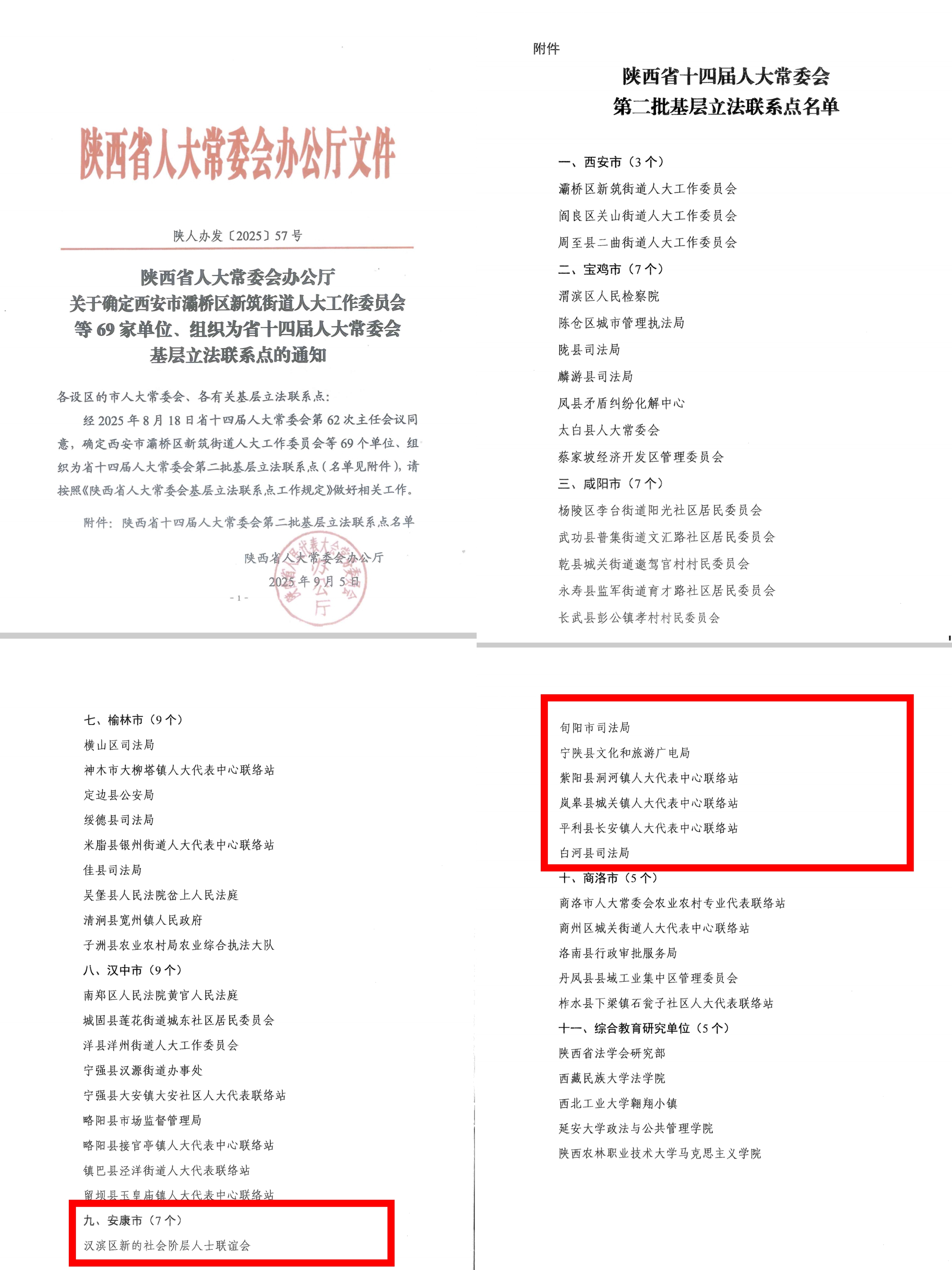 本網(wǎng)訊(通訊員 段文貞)9月5日,省人大常委會公布《陜西省十四屆人大常委會第二批基層立法聯(lián)系點名單》,我市漢濱區(qū)新的社會階層人士聯(lián)誼會、旬陽市司法局、寧陜縣文化和旅游廣電局、紫陽縣洞河鎮(zhèn)人大代表中心聯(lián)絡(luò)站、嵐皋縣城關(guān)鎮(zhèn)人大代表中心聯(lián)絡(luò)站、平利縣長安鎮(zhèn)人大代表中心聯(lián)絡(luò)站、白河縣司法局7家單位、組織成功入選。這是繼2023年省人大常委會在我市確立首批4個基層立法聯(lián)系點以來,通過綜合考核、嚴格篩選再次確立的7個基層立法聯(lián)系點,實現(xiàn)了全市各縣(市、區(qū))全覆蓋。