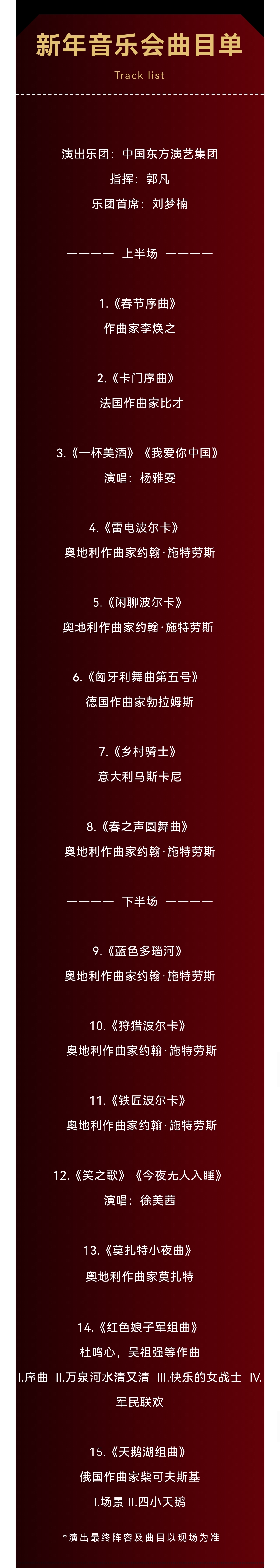 本場音樂會以“喜迎新年”為篇章,精粹二十首左右的中外“新年代表”經(jīng)典樂曲,獨具中國東方韻味的名曲和維也納新年音樂會的傳統(tǒng)樂曲,曲目中西合璧,加入極富創(chuàng)意的樂曲編排,歡快宏大、激情洋溢的音樂風(fēng)格,讓跨年氛圍與交響融合得渾然一體,在歡樂喜悅的音樂旋律中表達(dá)對新年新氣象的期盼與向往。