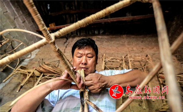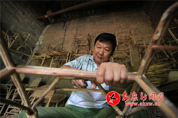 在白河大山深處,能編織制作藤椅的手藝人現(xiàn)在已經(jīng)不多了,經(jīng)過(guò)四處打聽(tīng)得知,五十二歲的周晉車仍然堅(jiān)守著自己的技藝。家住白河縣冷水鎮(zhèn)花灣村三組的周晉車高中畢業(yè)以后,1988年就開(kāi)始拜師學(xué)藝,逐漸掌握了剝、劃、拋、砍、燒、磨、纏、編、裁、劈、剖、削、撕、勻、刮等十八道工序以及粗、細(xì)藤條的全套編織技法。慢慢地,周晉車師傅遠(yuǎn)近聞名,不少外地客戶上門定做,產(chǎn)品一度銷售到西安、武漢、十堰、竹山、平利等地。