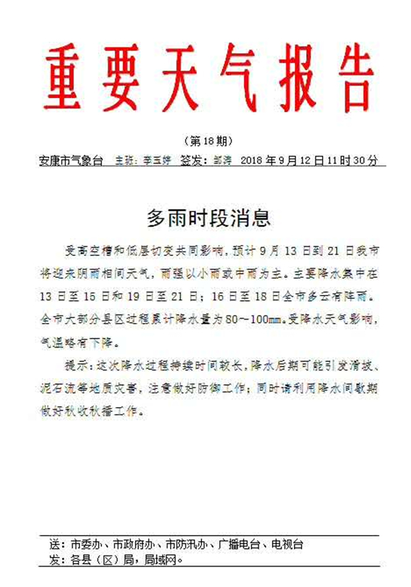 安康氣象臺11時(shí)30分發(fā)布降雨預(yù)報(bào),受高空槽和低層切變共同影響。預(yù)計(jì)9月13日到21日我市將迎來陰雨相間天氣。yKb安康新聞網(wǎng)