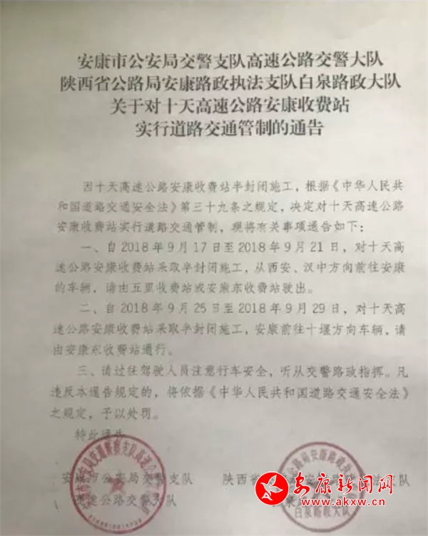 一、自2018年9月17日至2018年9月21日,對(duì)十天高速公路安康收費(fèi)站采取半封閉施工,從西安、漢中方向前往安康的車輛,請(qǐng)由五里收費(fèi)站或安康東收費(fèi)站駛出。