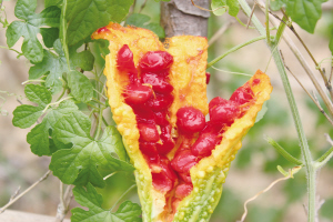 很快我就有了實(shí)地品嘗成熟苦瓜的機(jī)會(huì)。在一次出差途中,偶遇一個(gè)農(nóng)戶地里有未及時(shí)采摘的苦瓜,已經(jīng)變黃炸裂,熟透了。與未成熟時(shí)的白綠色不同,苦瓜成熟后變成了鮮艷的金黃色,頂端炸裂反卷,露出鮮紅的種子,一副很好吃的樣子。經(jīng)過品嘗,苦瓜的外皮有些沙沙的、面面的感覺,依然發(fā)苦;而里面的種子,其紅色的外皮(假種皮)吃起來幾乎已經(jīng)沒有了苦味,略微發(fā)甜,但并不是非常甜,而且是怪怪的甜味。當(dāng)然,成熟的苦瓜當(dāng)蔬菜的話已經(jīng)沒有一點(diǎn)兒食用價(jià)值了,倒是有些做水果的潛質(zhì)。