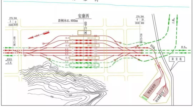 新建安康西站為安康樞紐主要客運站,辦理始發(fā)作業(yè),車站位于安康市高新區(qū)西側(cè)、富家河西岸,配套站前廣場與城市規(guī)劃緊密銜接。