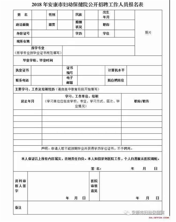 3.報(bào)名要求:應(yīng)聘人員需在報(bào)名前,登錄安康市婦幼保健院官網(wǎng)(http://www.akfy.com.cn),下載打印《2018年安康市婦幼保健院公開招聘工作人員報(bào)名表》,用黑色中性筆填寫,提供近期2寸免冠照片2張、本人身份證、畢業(yè)證、教育部學(xué)歷在線驗(yàn)證報(bào)告、學(xué)位證、就業(yè)推薦表(應(yīng)屆生)及應(yīng)聘崗位需要的證書原件及復(fù)印件。