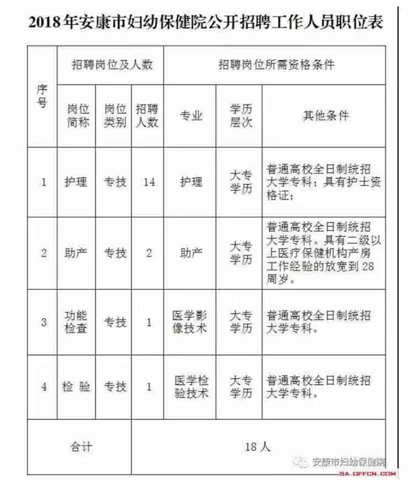 經(jīng)安康市衛(wèi)計(jì)局批準(zhǔn),安康市婦幼保健院院2018年擬公開招聘護(hù)理等專業(yè)技術(shù)人員,F(xiàn)將有關(guān)事項(xiàng)公告如下: