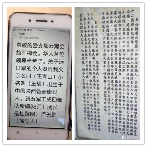 她們記得很清楚,父親后半生一直念叨的事情就是想回家,回到祖籍陜西安康落葉歸根,但是這個(gè)愿望一直沒(méi)有實(shí)現(xiàn)。父親名叫王清山,是陜西安康人,13歲的時(shí)候毅然決然地加入遠(yuǎn)征軍,隨軍入緬甸抗戰(zhàn),而這一走沒(méi)想到就是一輩子再也沒(méi)有回來(lái)過(guò)。