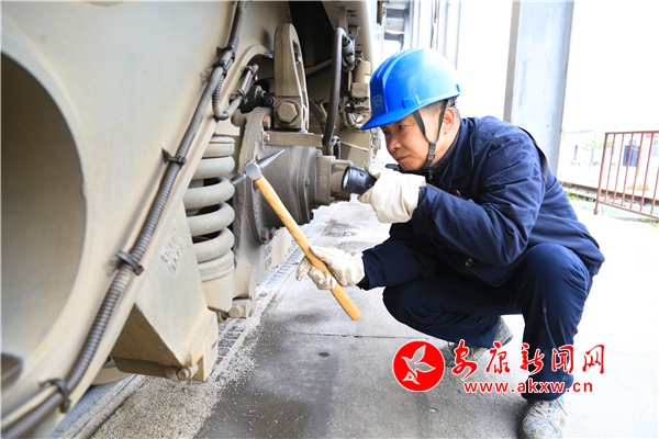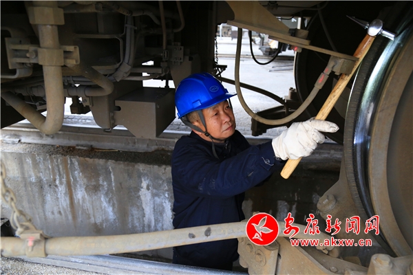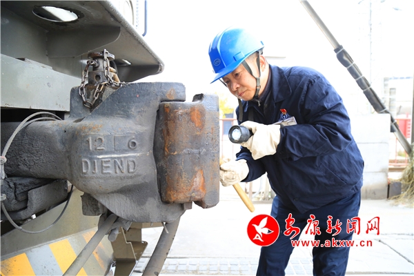 他中等身材,頭戴藍色安全帽,右手拿檢車錘,左手持攝像手電,如同文物品鑒師一般,一厘米、一厘米掃描,生怕錯過什么似的,時而弓步、時而馬步、時而側步,對作業(yè)范圍仔細查看,這已是他職業(yè)生涯的第30個春運。
