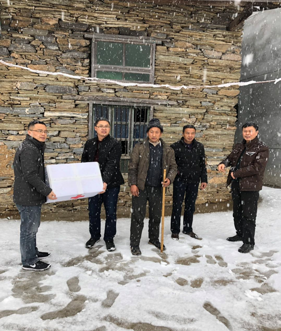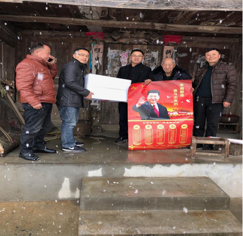 通過(guò)1個(gè)多小時(shí)的跋涉,慰問組成員來(lái)到大溝河村14組,下車后,首先映入我們眼簾的是漫山銀裝,地面覆蓋了厚厚的積雪,天空中飄著鵝毛大雪,一位耄耋老人守候在屋檐下,面帶微笑的招呼我們進(jìn)屋,他就是我們要慰問的王所西老人,老遠(yuǎn)就聽他說(shuō):“太感謝你們了,這么大的雪,你們還來(lái)給我送東西!”。通過(guò)我們與他深入交流,得知老人家的妻子和兩個(gè)兒子都已不幸離世,只有他一人獨(dú)守老屋,日子過(guò)得苦巴巴的,看著老人家獨(dú)處的身影和滿意的微笑,我們都禁不住流下了淚水。雖然我們給他送去了一點(diǎn)點(diǎn)慰問品,但在老王心中就是莫大的精神安慰和滿足。